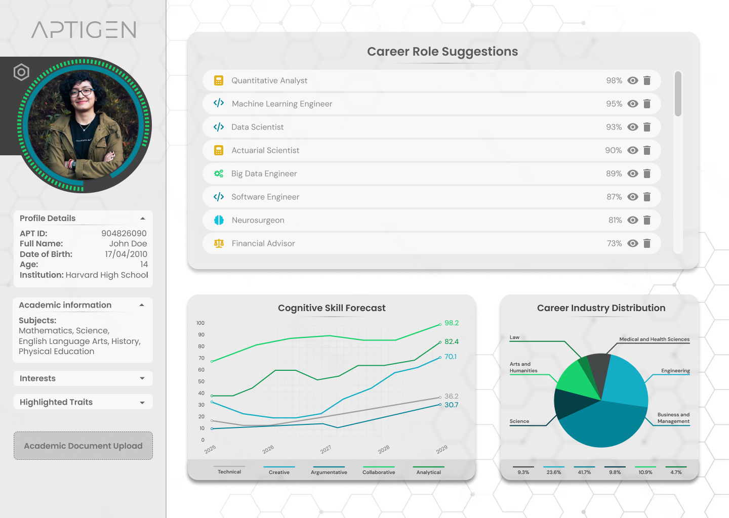 Aptigen delivers customized career recommendations based on academic performance, personality, emotional intelligence, and interests, providing success probabilities and rationale.