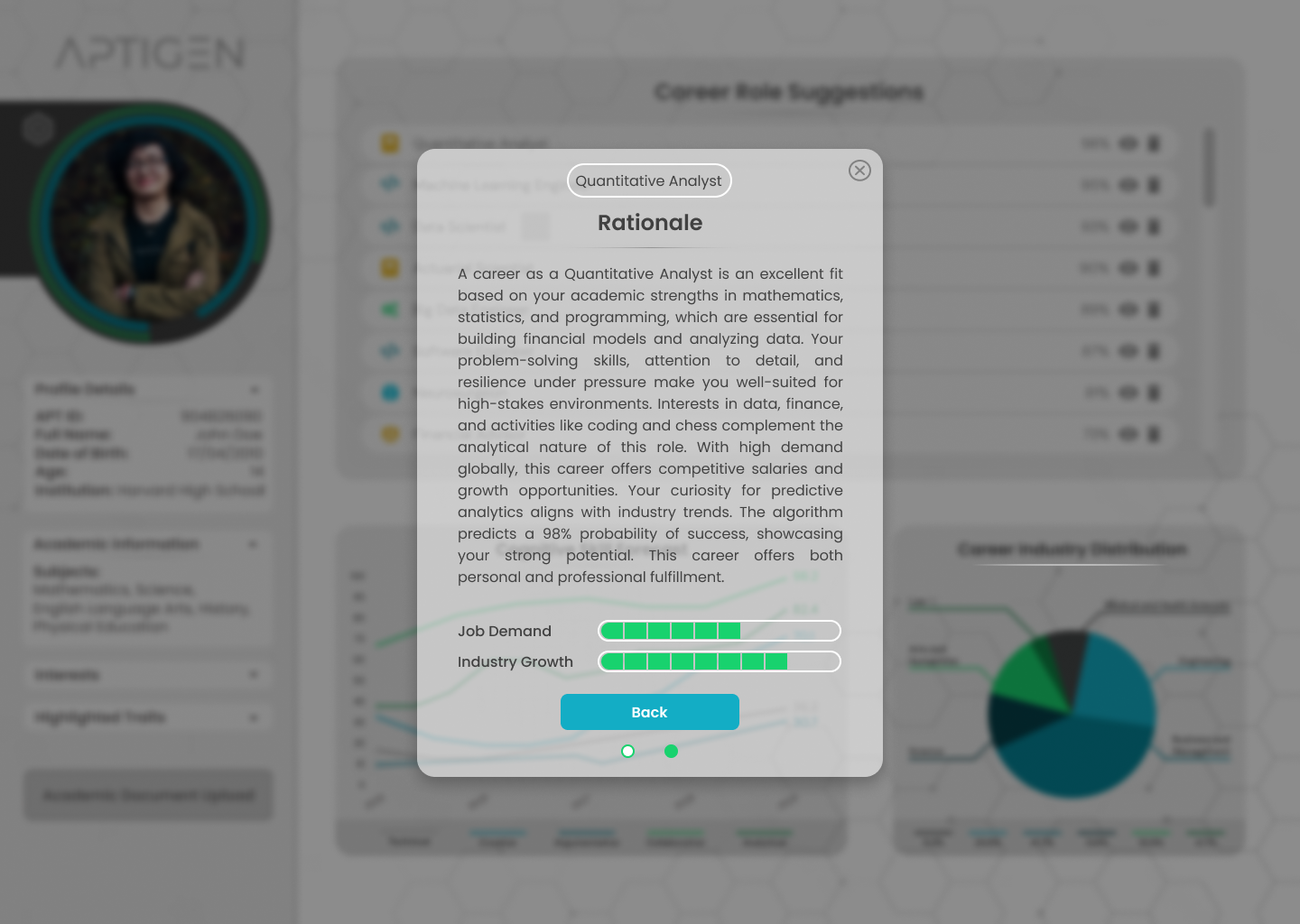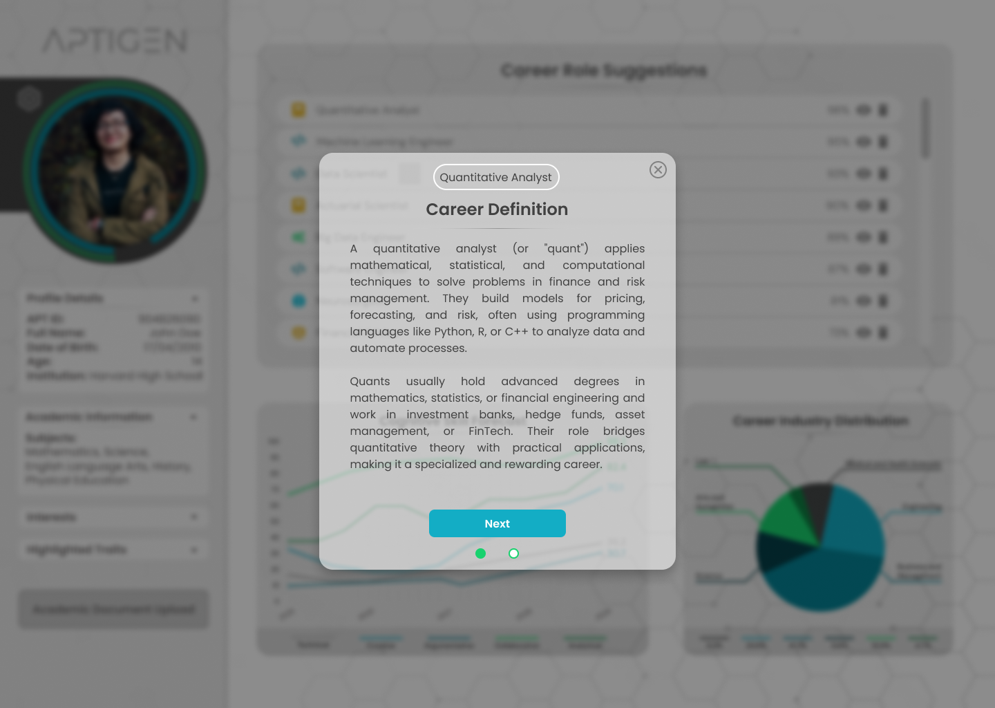 Aptigen transforms career guidance by evaluating Academic Performance, Personality, Emotional Intelligence, and Interests to deliver precise, data-driven career insights and forecasts. Our assessments provide a top 10 career list, success probabilities, job demand, and industry growth, along with a five-year skill forecast. The Industry Distribution Ratio further highlights opportunities across various fields, empowering users to make informed, strategic, and confident career decisions tailored to their unique strengths, goals, and long-term potential.